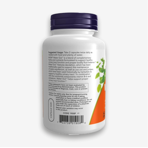 NOW  Water Out is a blend of complementary herbs and nutrients formulated to support healthy urinary tract function and proper bodily fluid balance. Water Out features dandelion, which has been traditionally used to support the maintenance of water equilibrium, as well as uva ursi and juniper, which have been used historically by herbalists to support a healthy urinary tract. In combination with the nutritional components vitamin B-6 and potassium, Water Out helps support proper urinary tract function.